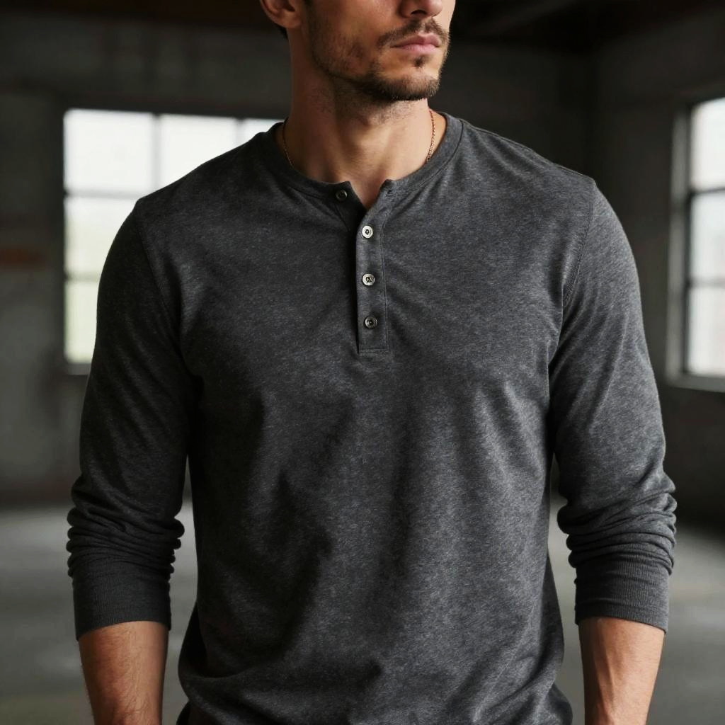 Portrait of a man wearing a classic henley shirt, rugged look with stubble, industrial loft background, moody lighting emphasizing fabric details, muted colors, urban streetwear vibe, high resolution fashion editorial shot