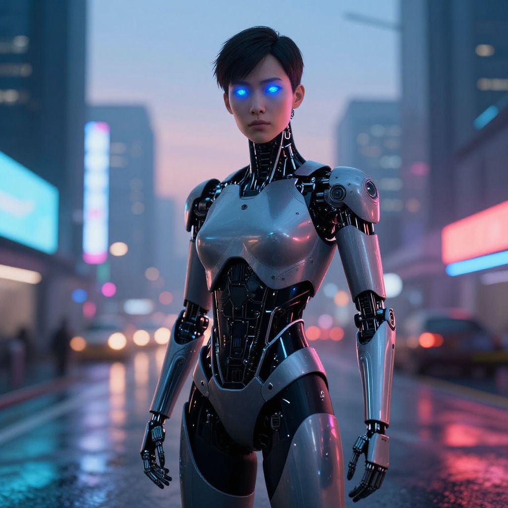 CGI image of a futuristic, glowing blue-eyed robotic woman with short black hair in a neon-lit, rainy city street.