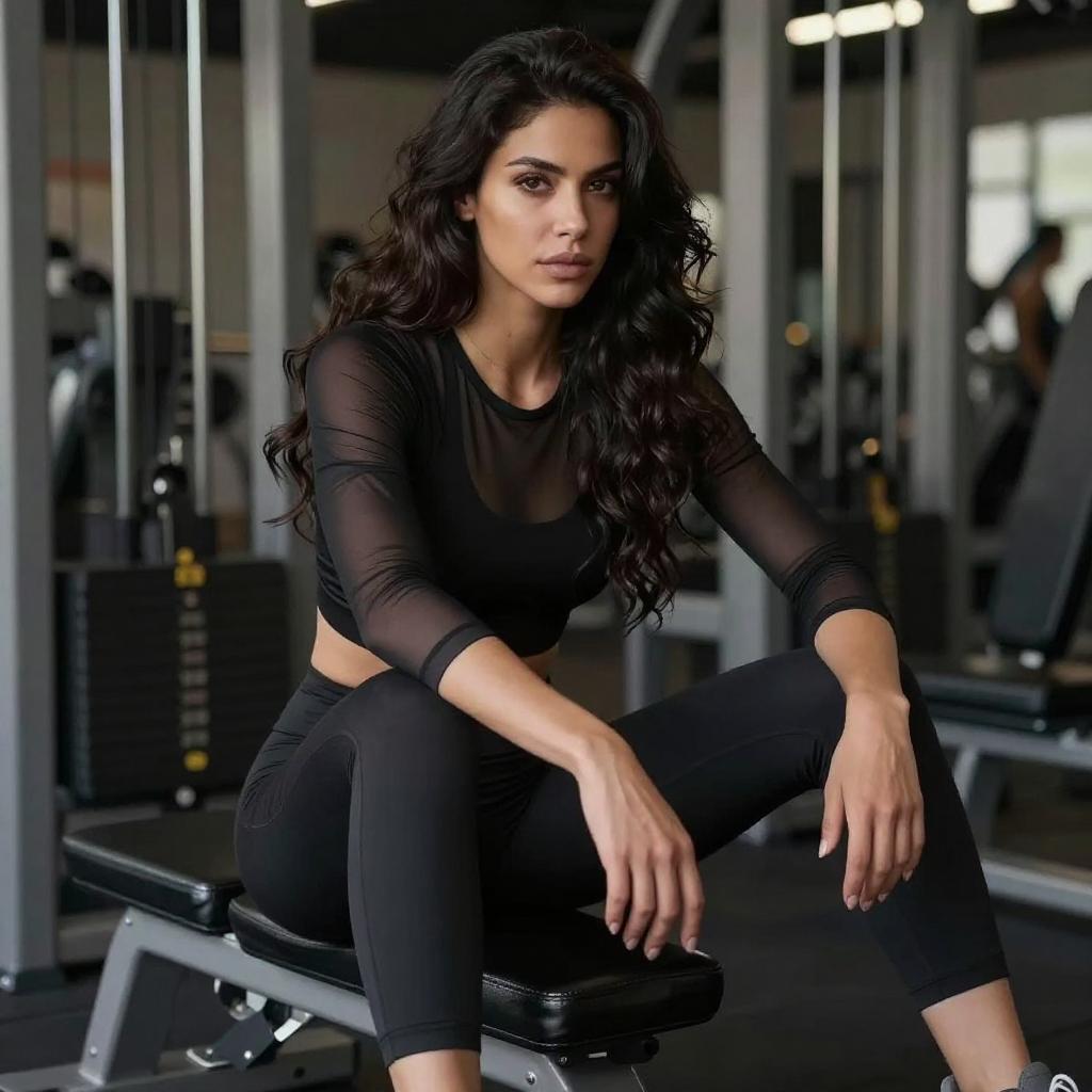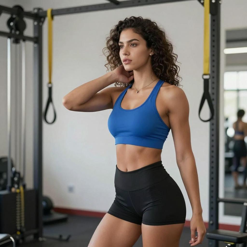 Photograph of a fit woman with light brown skin and black hair in a ponytail, wearing a black sports bra and black leggings, standing in a modern gym. She has her hands on her head, looking slightly to the side. Gym equipment, including weights and machines, is visible in the background.