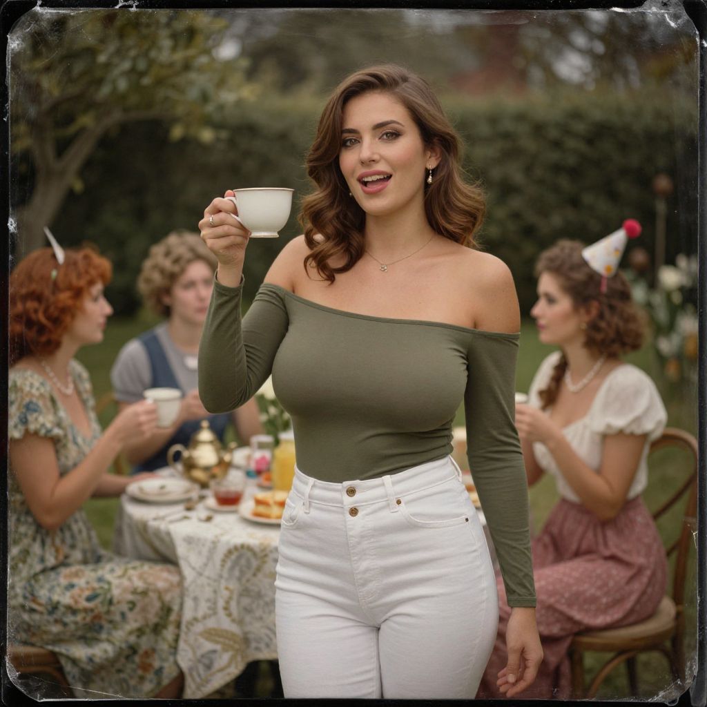 A woman in an olive green cold-shoulder top and white high-waisted skinny jeans, enjoying a garden tea party with whimsical friends, captured in a Collodion wet plate style, as she laughs and raises her teacup in a toast. Sexy. Pretty face and beаutiful eyes. Big breasts