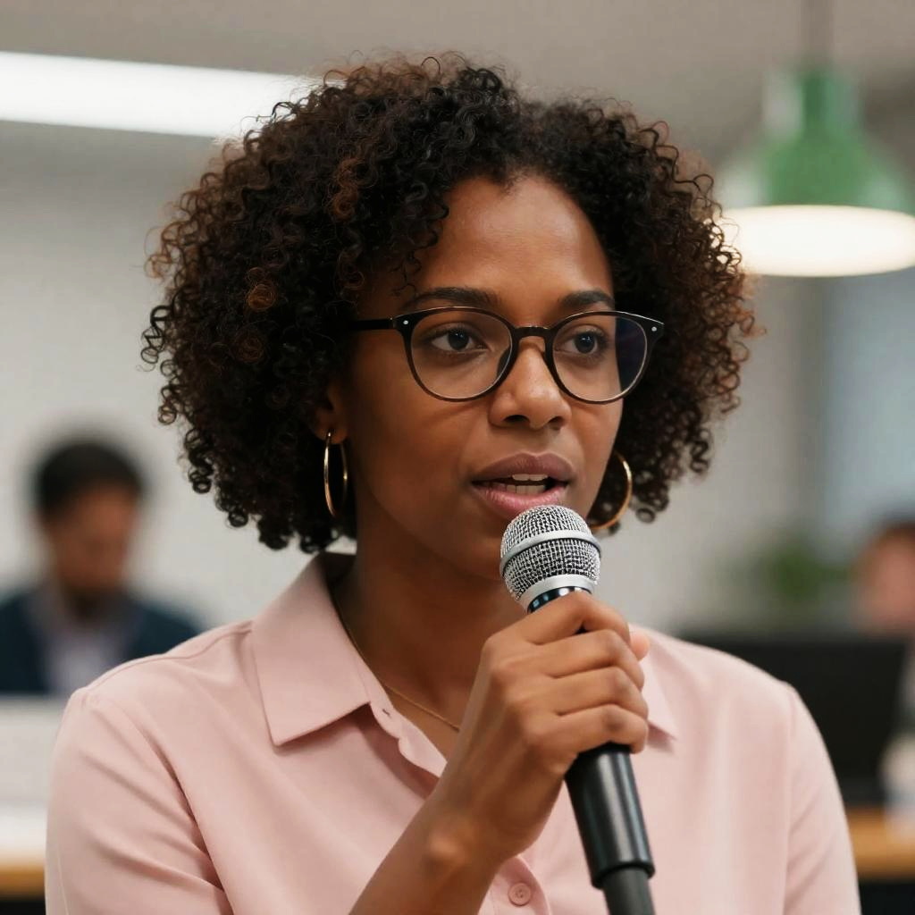 Photograph of a smiling woman with dark brown skin, black curly hair in a ponytail, wearing a red top. She has dark pink lipstick and white teeth. Blurred background with soft lights. Upper body visible. One person in foreground.