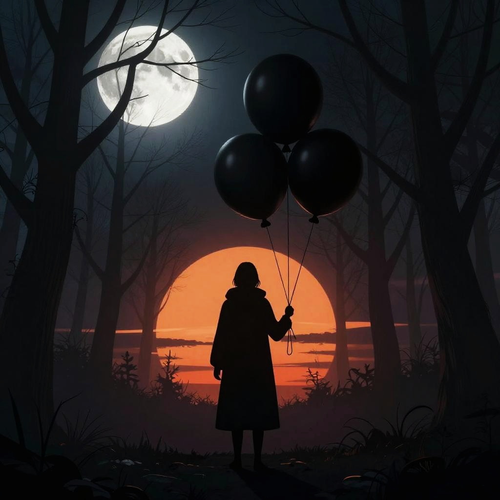 A spooky digital illustration shows a dark forest with leafless trees under a glowing full moon. A shadowy figure in a long coat holds three large black balloons, casting a silhouette against an orange sunset. The eerie, gothic scene blends dark blues and blacks with warm hues from the sunset, creating a mysterious and haunting atmosphere.