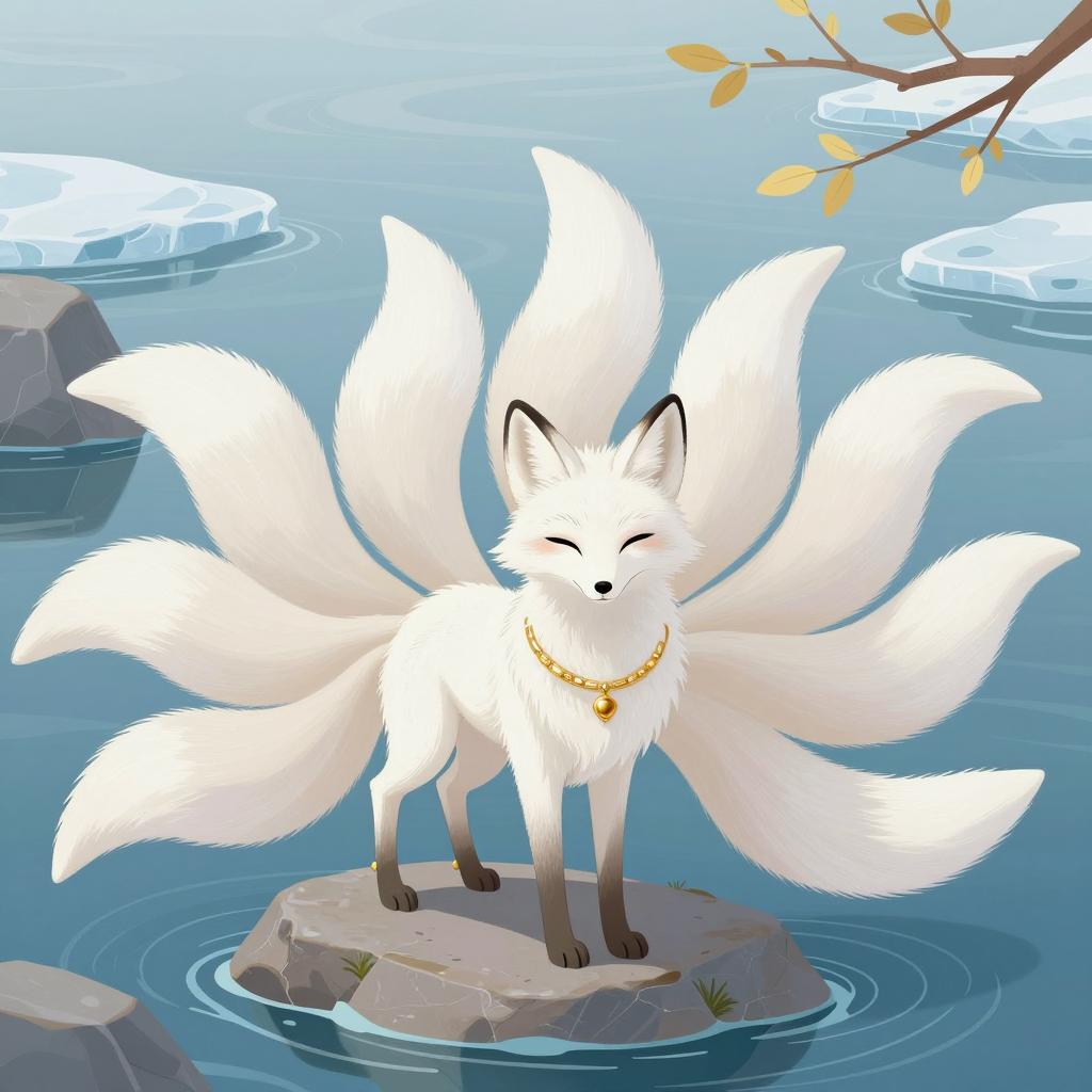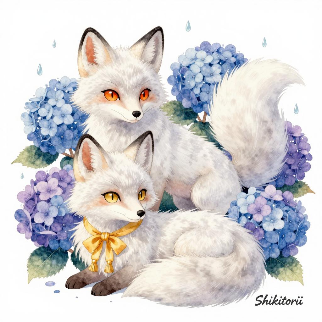 Watercolor illustration of two white foxes with orange eyes. Upper fox has orange eyes, lower fox has yellow eyes. Lower fox wears yellow ribbon with gold tassels. Both foxes have fluffy tails, surrounded by blue and purple hydrangeas. Raindrops falling. Artist "@Shikitorii" at bottom right.