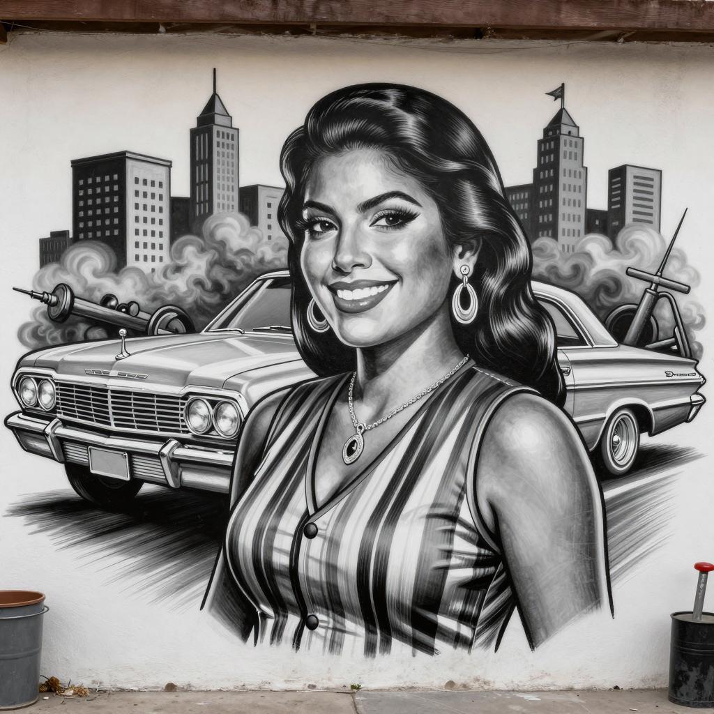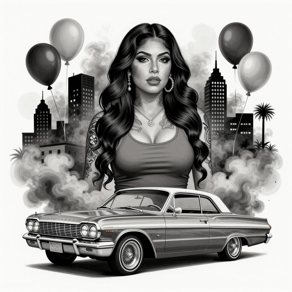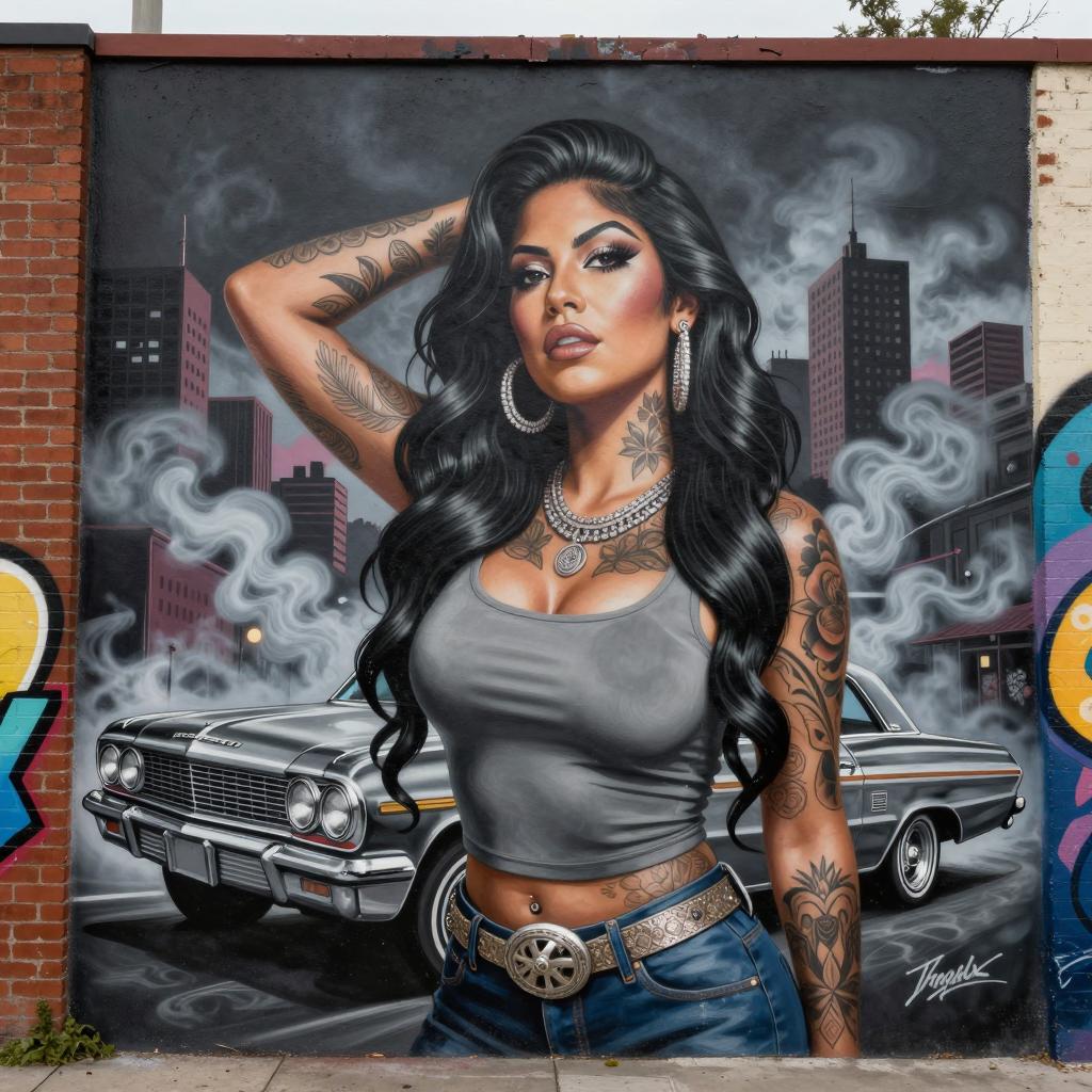 Chicano art drawing of tattooed woman with long wavy hair in a fitted top surrounded by lowrider car and city buildings emerging from smoke in urban alley with brick walls and murals with soft airbrush transitions and smoky background, highly detailed mural and tattoo flash style
