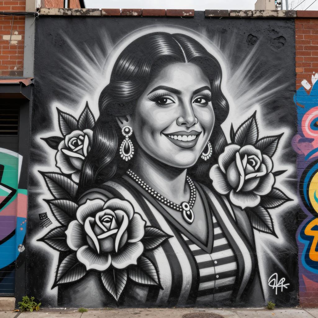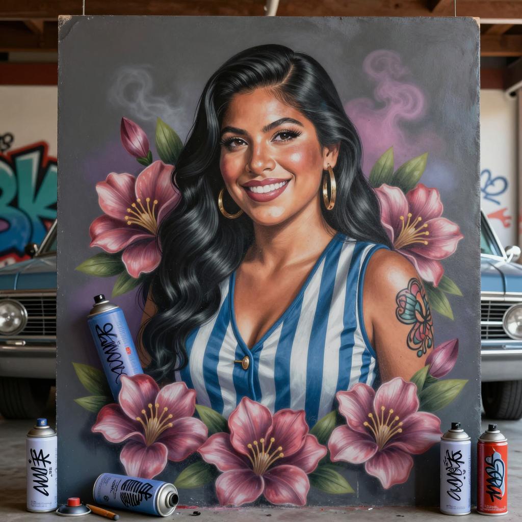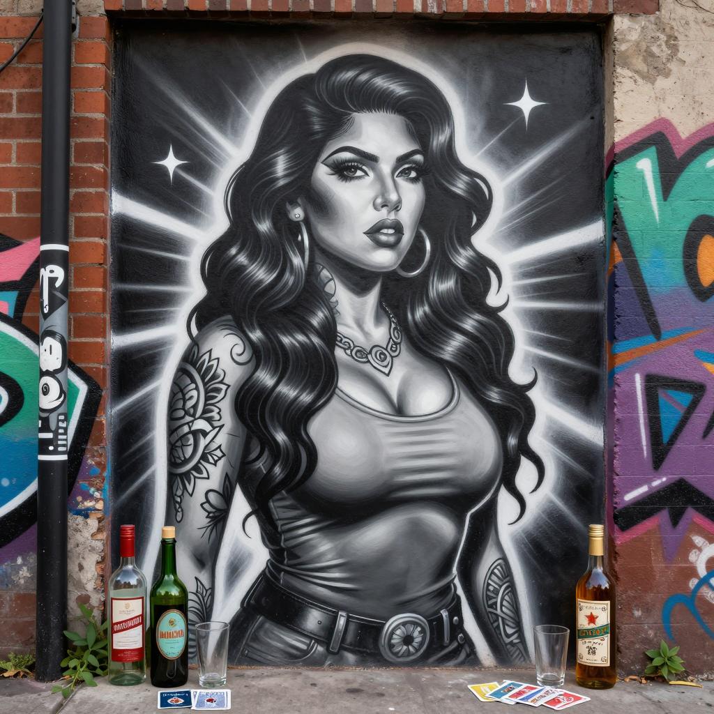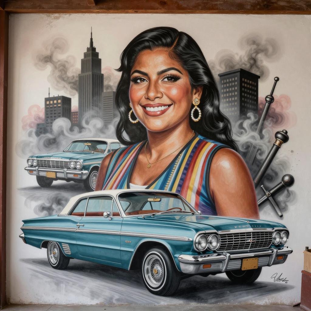 Chicano art drawing of tattooed woman with long wavy hair in a fitted top surrounded by lowrider car and city buildings emerging from smoke in urban alley with brick walls and murals with soft airbrush transitions and smoky background, highly detailed mural and tattoo flash style