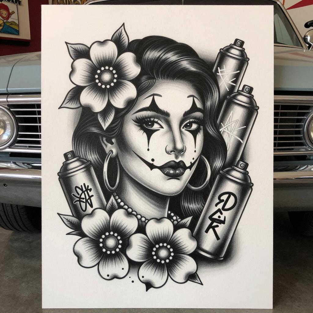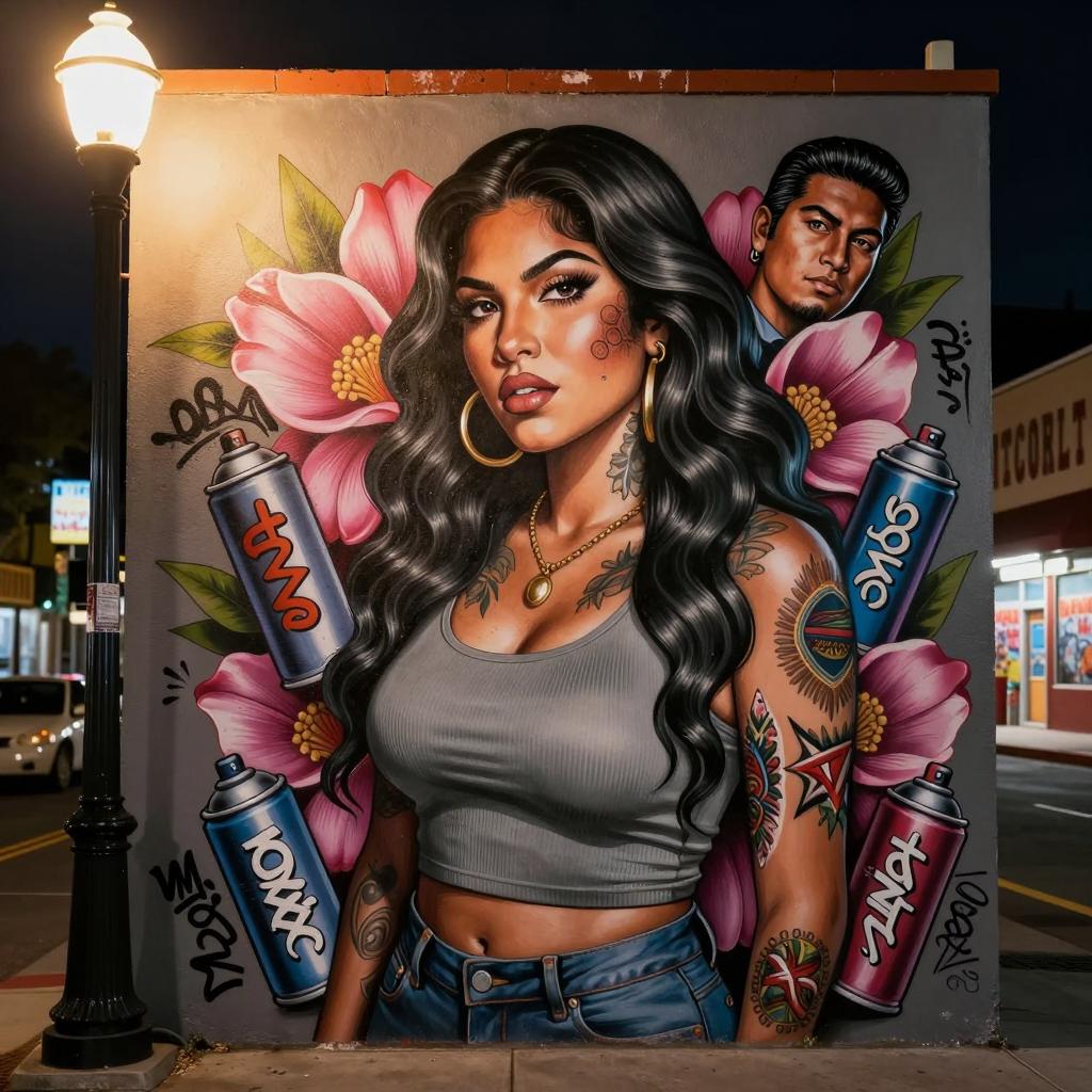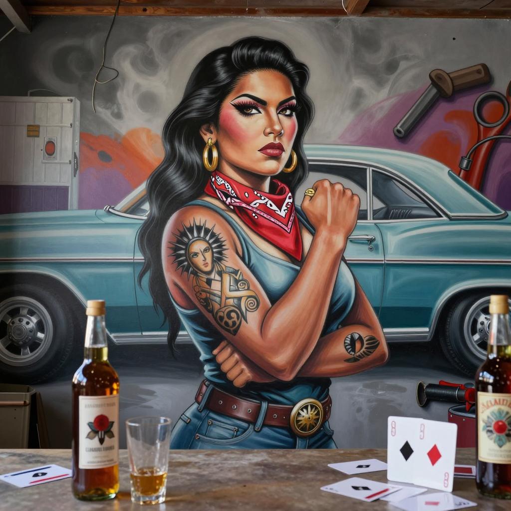 Intricate Chicano Art: Tattooed Woman & Lowriders