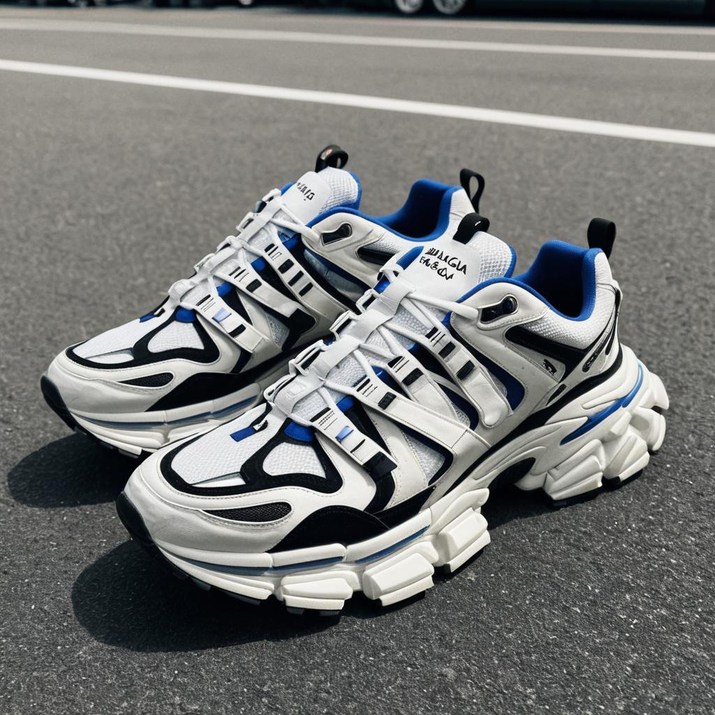 Close-up studio shot of Balenciaga Track 3.0 sneakers featuring transparent layered materials in white, blue, and black colors. The sneakers showcase chunky soles with detailed textures, lace-up design, and branded pull tabs on the tongue and heel. Fashion-forward, modern athletic footwear.