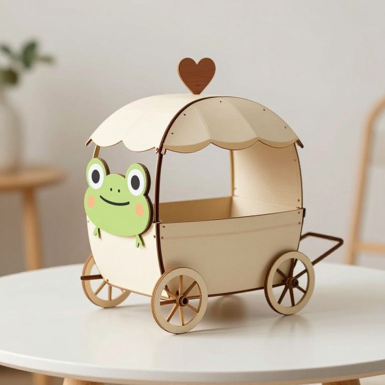 A whimsical, laser-cut carriage box adorned with a playful frog face and a heart-shaped canopy floats serenely on a table, defying the mundane with its enchanting charm.