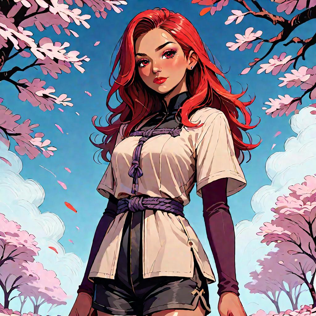 Red-Haired Anime Girl Sitting Outdoors