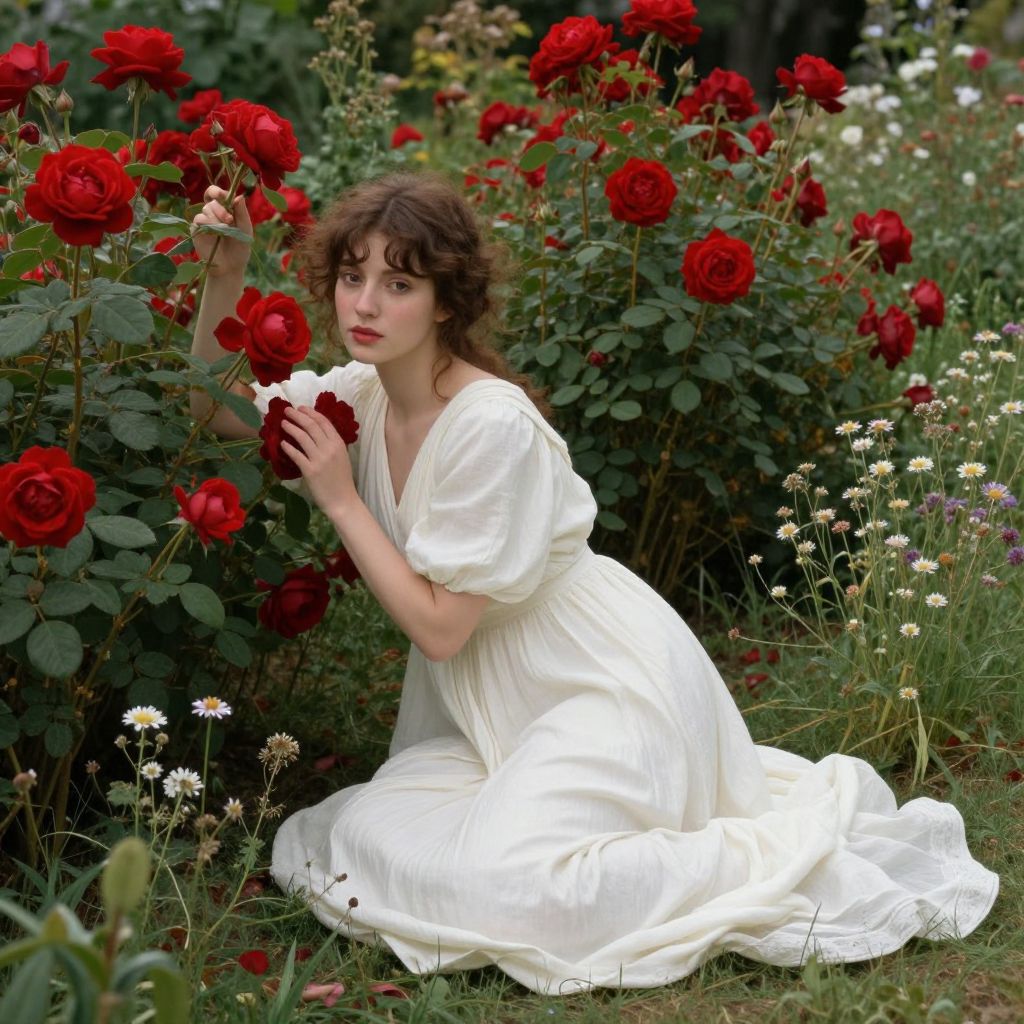A woman in a flowing white dress kneels amidst a lush garden of vibrant red roses and delicate wildflowers, evoking the romantic realism of Sir John Everett Millais' style, rendered with meticulous detail and dramatic lighting in a high-definition digital art composition.