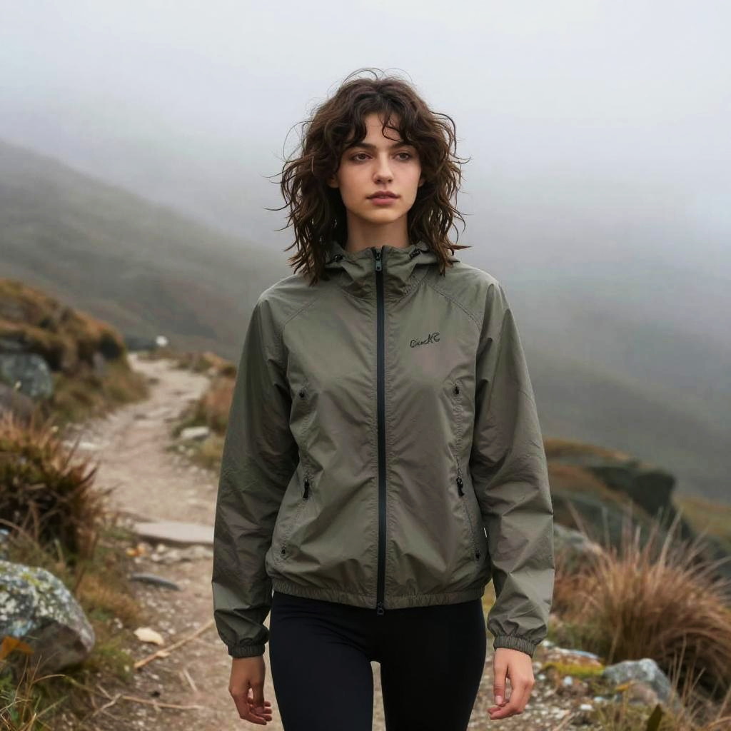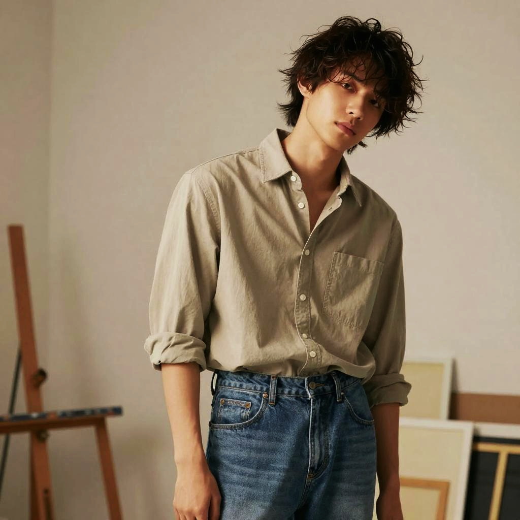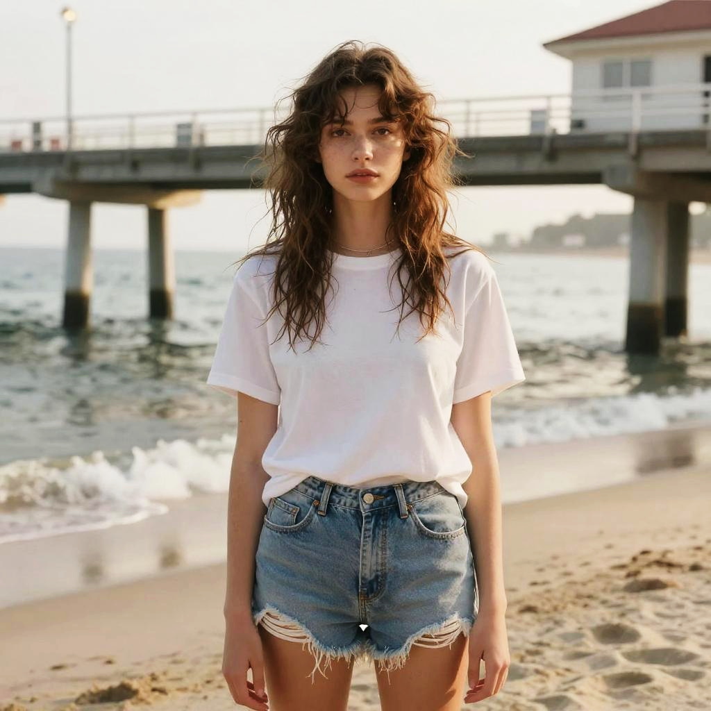 Messy Fringe hairstyle on young woman, wearing casual T-shirt and shorts, in beach pier, captured in fashion editorial style with soft morning light.