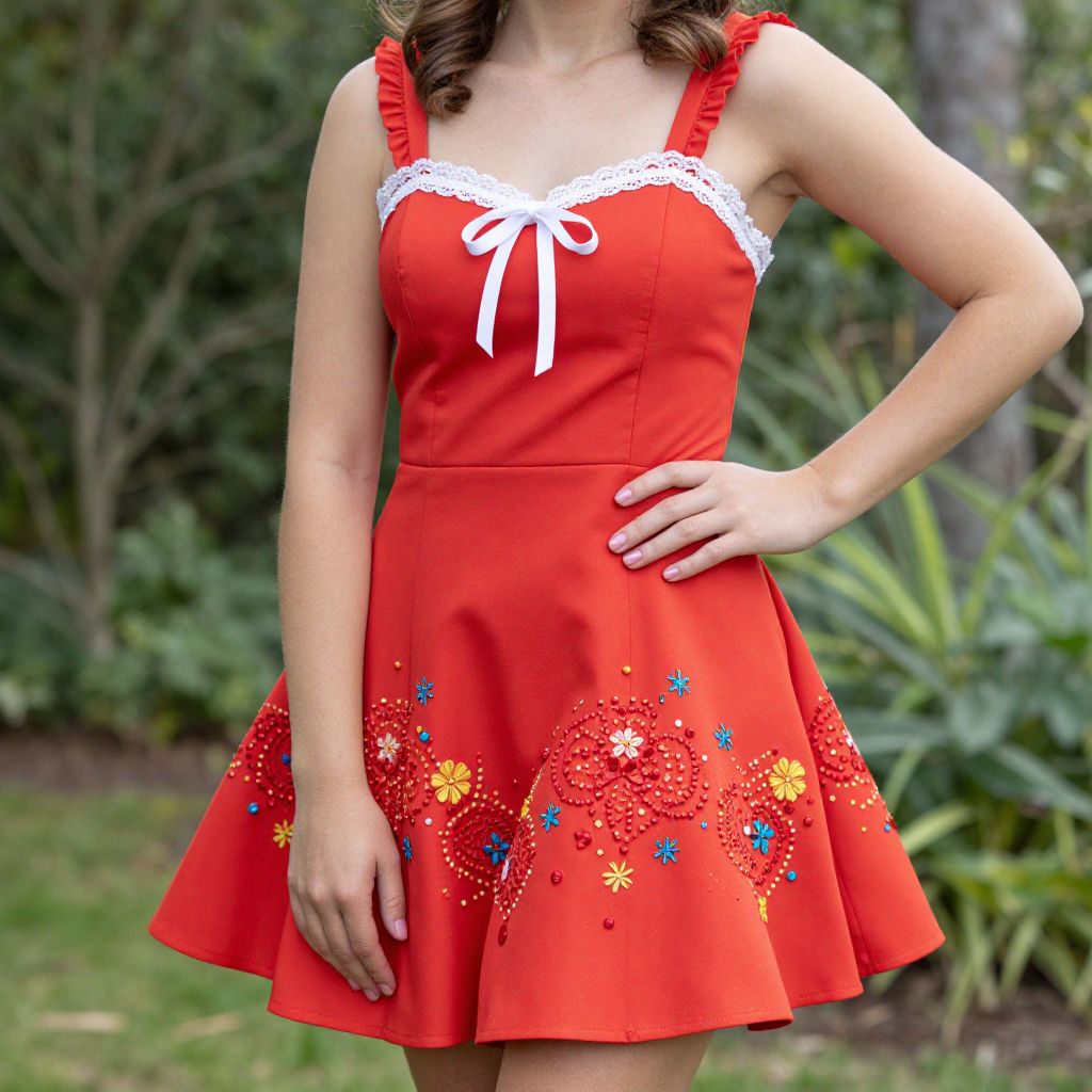 Photograph of a woman in a bright red, sleeveless dress with white lace trim and colorful floral embroidery, standing outdoors.