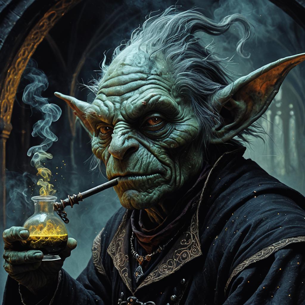 Portrait of a male goblin alchemist, dark fantasy, Wayne Barlowe, detailed digital painting with muted colors, swirling chemical fumes, grimdark, Gothic style.