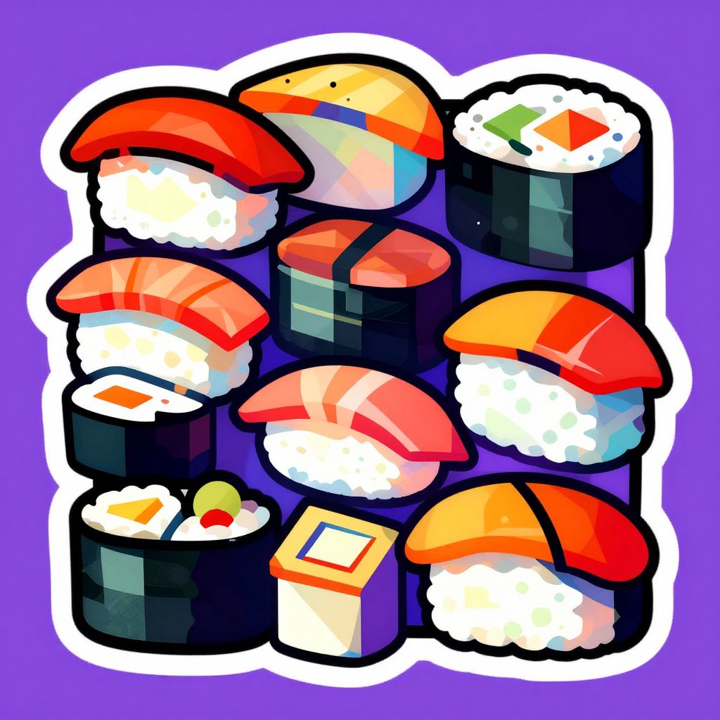 Colorful digital illustration of eight sushi rolls with various toppings including salmon, tuna, and avocado, stacked against a purple background.