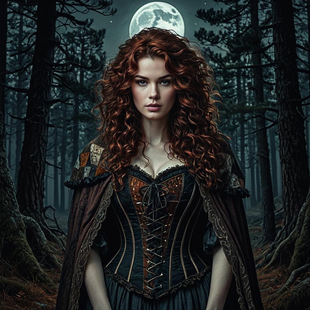 Highly detailed digital portrait of a young woman with deep auburn, curly hair wearing an earth-toned patchwork cloak and a lace-up corset. Set in a dense pine forest illuminated by eerie moonlight, the image conveys a gothic and mysterious atmosphere with soft, romantic styling. The subject's intense gaze and intricate clothing details enhance the enchanting mood.