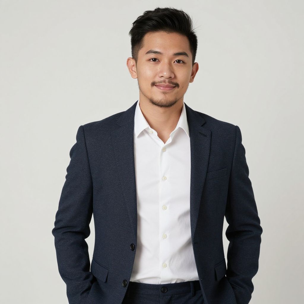 Photograph of a young Asian man with short, black, slightly spiked hair and a trimmed mustache. He is wearing a dark navy blue suit jacket over a white dress shirt, with his hands casually in his pockets. His skin tone is light to medium, and he is smiling softly at the camera. The background is a plain, bright white, making him the focal point. The image has a clean, professional look with even lighting and sharp focus.