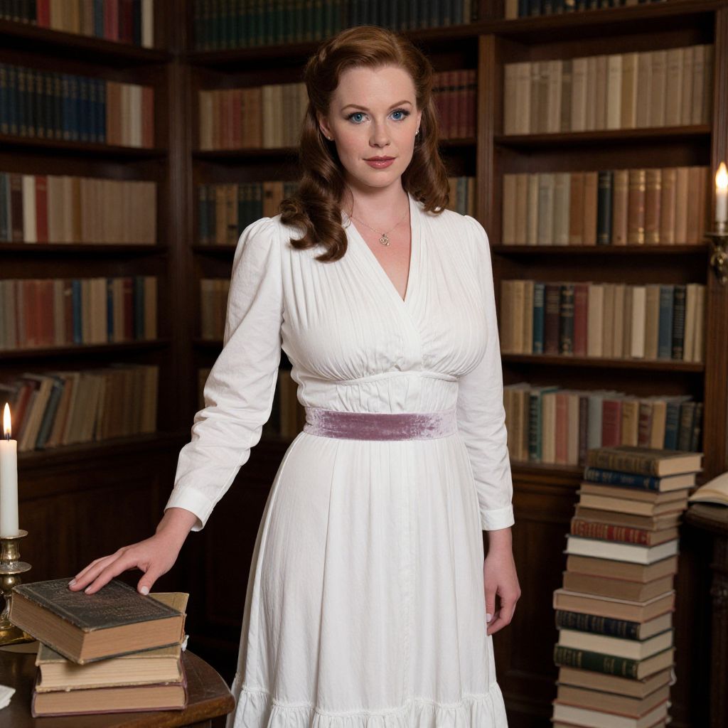 A woman with a porcelain complexion and bright blue eyes stands in a candlelit vintage bookstore, dressed in a nice long white dress with a soft ruffled hem and a velvet waist, wearing a costume that resembles a 1940s librarian from an old film, books scattered around her with her hand resting on a vintage novel.. The woman has big tits and cute face