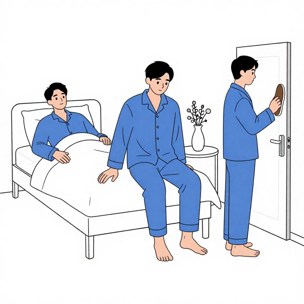 Illustration of a man in blue pajamas, sequentially positioned. Left: lying in bed, right hand resting on pillow. Center: sitting on bed, barefoot, looking down. Right: standing, opening door, holding brown shoe. Background: white, minimalistic. Objects: bed, pillow, table, vase with flowers. Line art style.