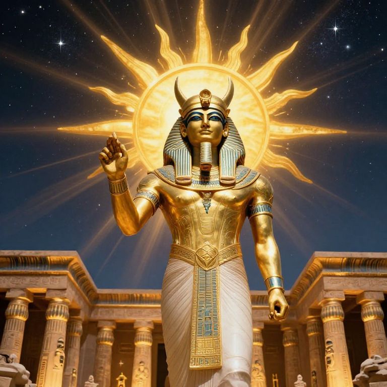 Rah, portrayed as a cosmic sun god with intricate ornate armor made of gold and light, commanding beams of sunlight amidst a starry sky backdrop, with ancient Egyptian temples illuminated beneath the bright sun.
