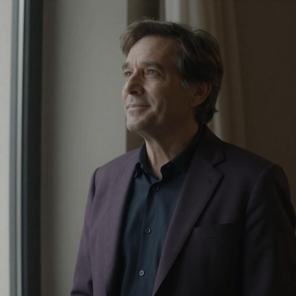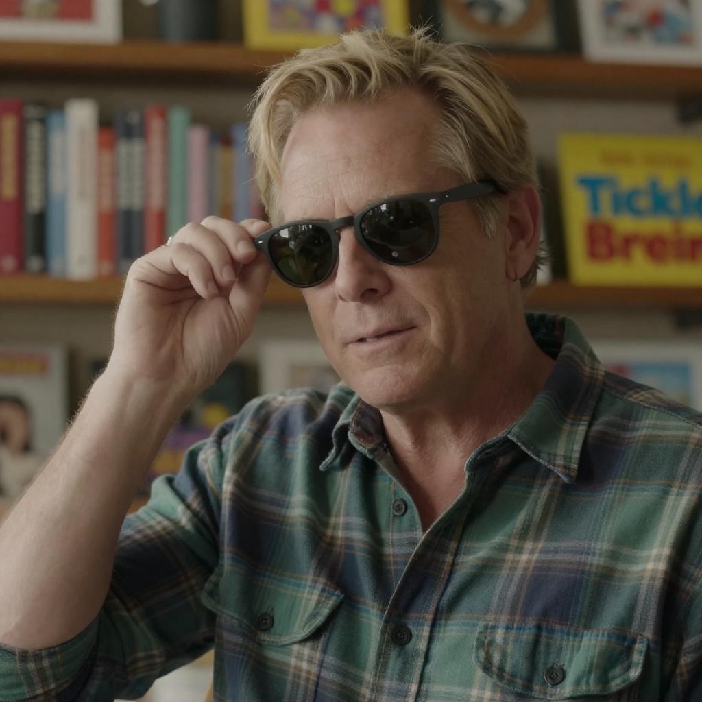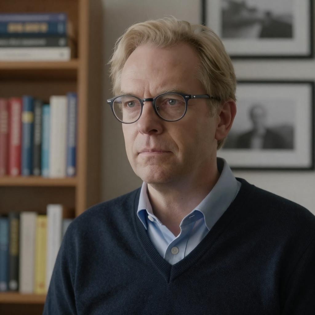 Middle-aged man with light brown hair, wearing a blue plaid shirt, smiling slightly. Background: lamp, blinds, stacked papers. Indoor setting.