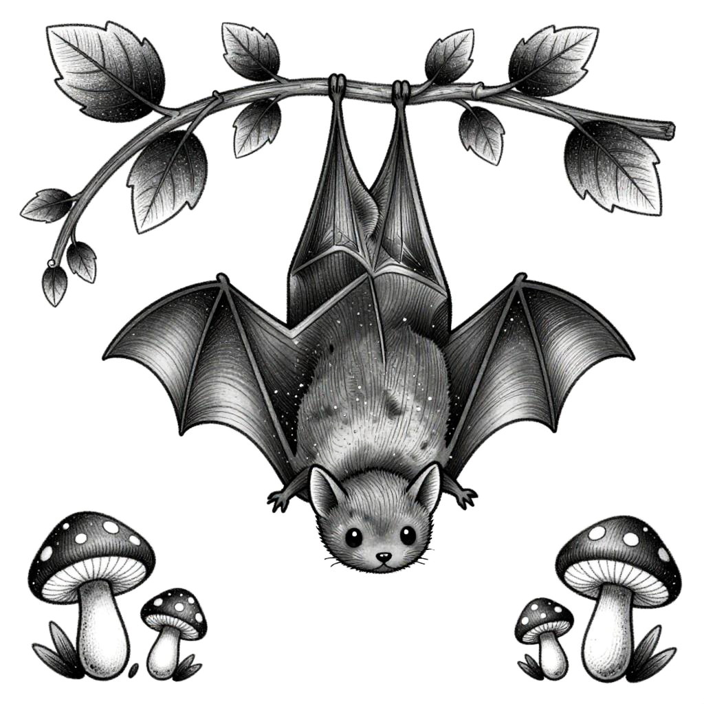 Adorable cute bat tattoo, black and grey ink, small size, cozy and friendly bat hanging upside down from a vine, intricate fine line details, subtle dot shading, natural theme with leaves and small mushrooms