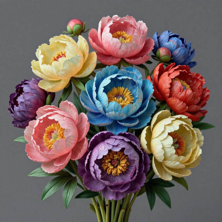 A vibrant, photorealistic bouquet of peonies in the style of Van Gogh, featuring rainbow colors and intricate details, created using advanced 3D rendering techniques.