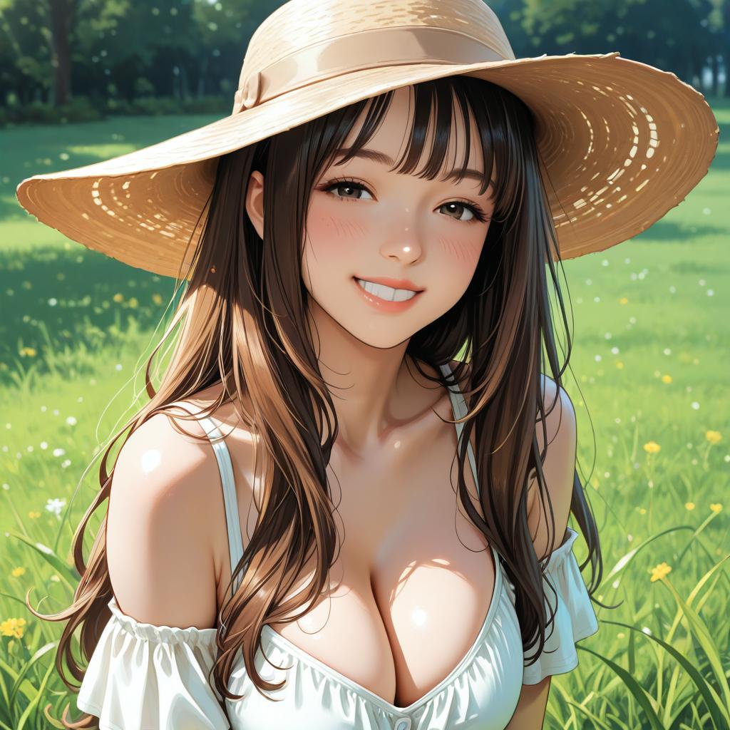 Digital anime-style photograph of a smiling young woman with long brown hair, wearing a large straw hat and white off-shoulder top, in a sun