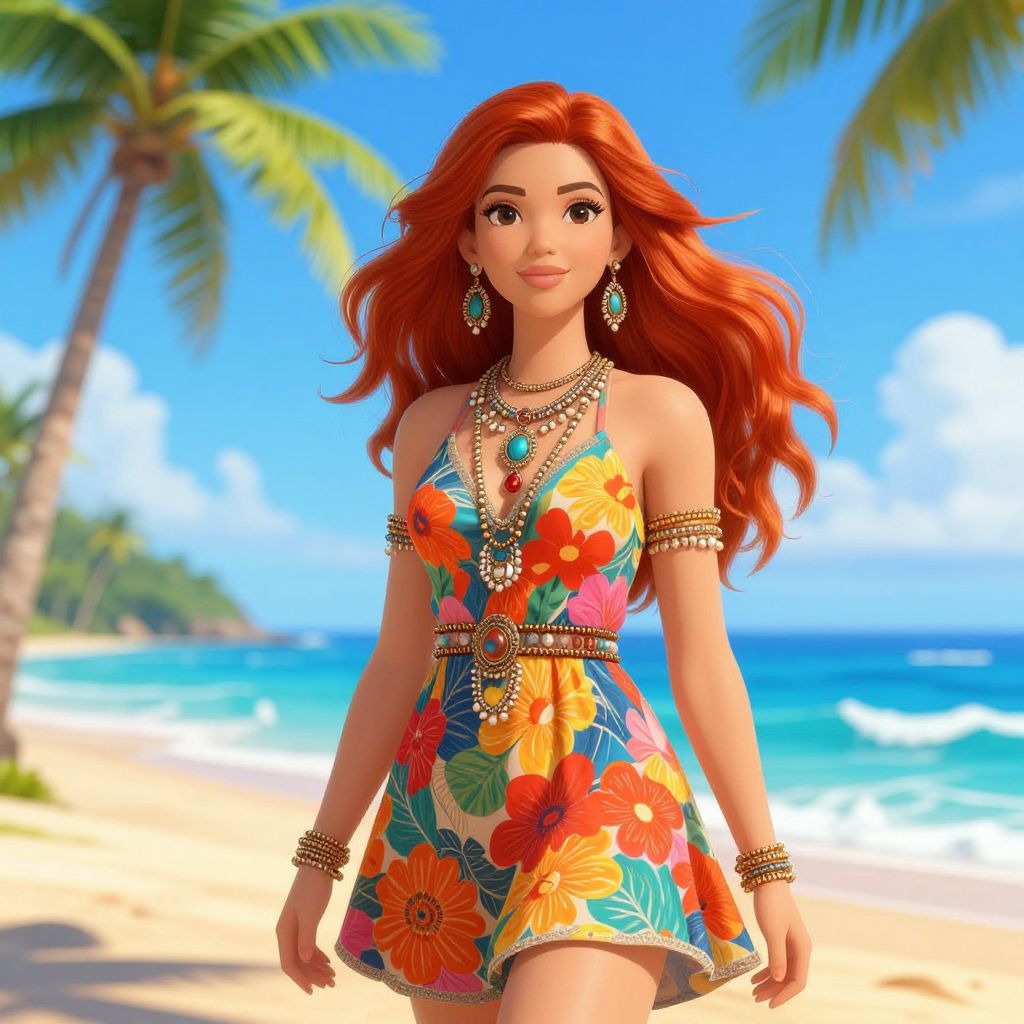 A vibrant illustration of a woman with long, flowing red hair, styled against a dynamic background filled with geometric patterns and bold colors. She is wearing an orange bikini, exuding confidence and a sense of summer fun.
