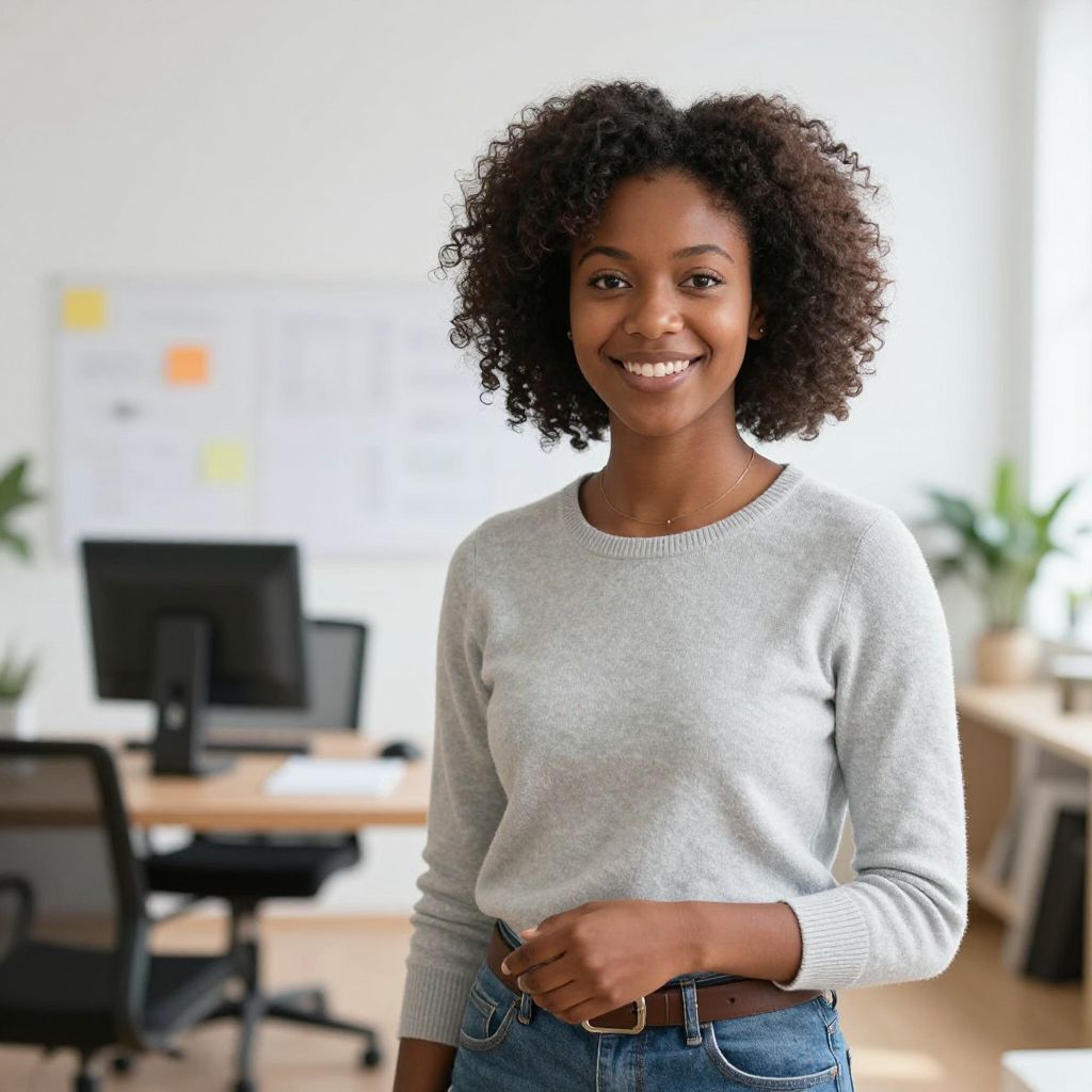 Photograph of a smiling Black woman with medium-dark skin and natural, curly black hair. She wears a light gray, long-sleeved sweater and blue jeans, standing in a bright, modern office. The background shows a blurred whiteboard with colorful notes, a black computer monitor on a desk, and potted plants. The woman's relaxed posture and friendly expression convey a welcoming and approachable demeanor. The office has a clean, professional look with natural light illuminating the space.