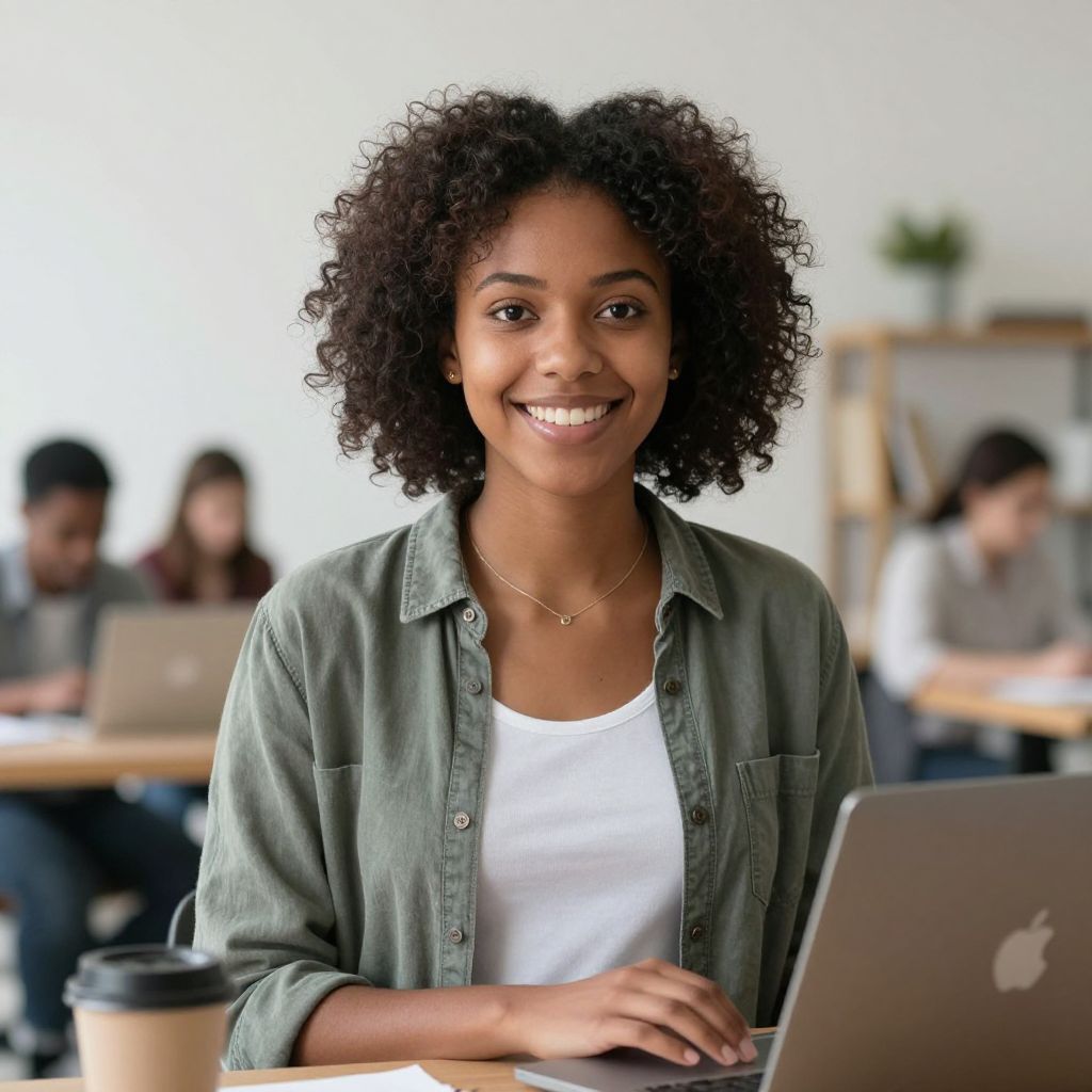 Photograph of a smiling Black woman with curly hair, wearing a gray sweater and blue jeans, standing in a bright, modern office with desks and p