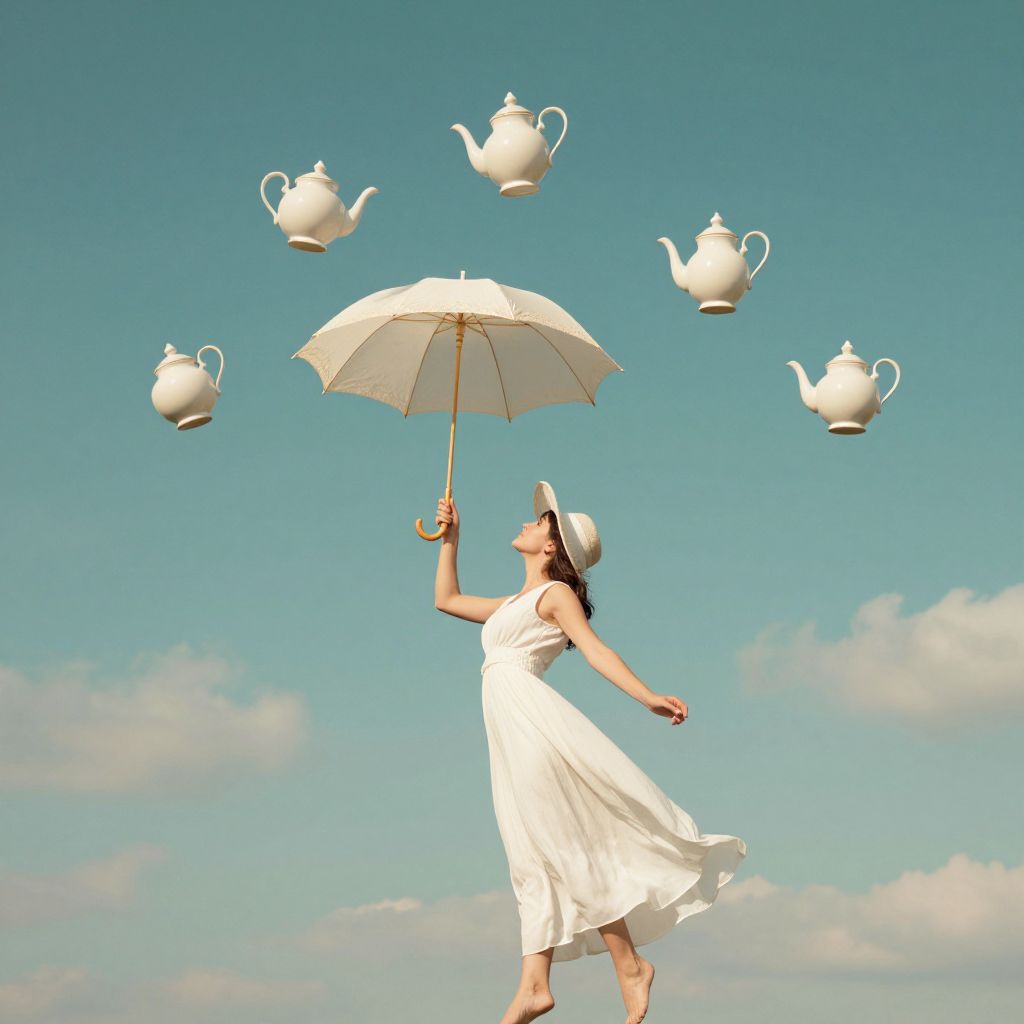 A whimsical scene unfolds as a woman in a flowing white dress and wide-brimmed hat holds aloft a large, open parasol, beneath which seven teapots hover gracefully against a serene teal sky dotted with fluffy white clouds.