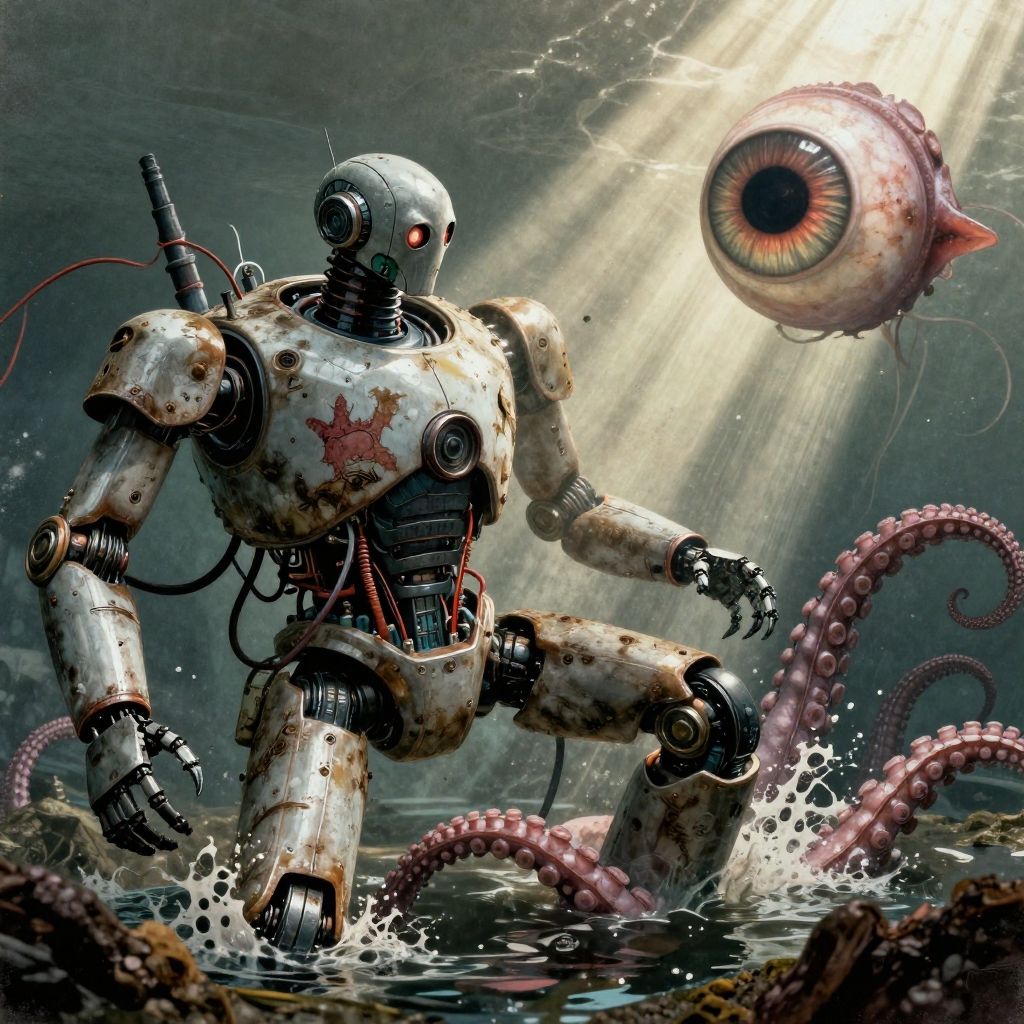 Cinematic pulp magazine cover, gritty, detailed, realistic textures, battered robot, exposed wires, claw marks, giant squid eye, murky water, shafts of sunlight, tentacles wrapped around robot, desperate struggle, fight for survival