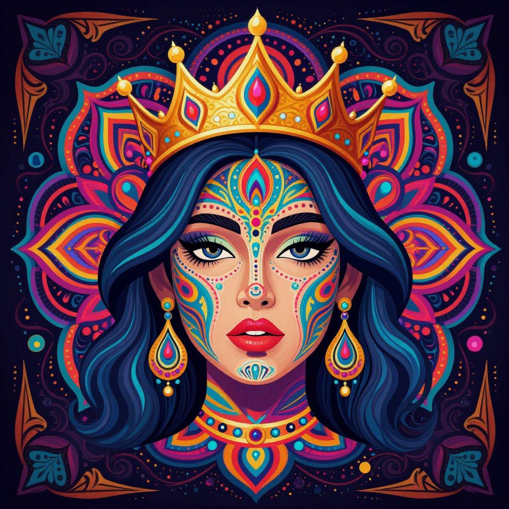 A vibrant, psychedelic illustration featuring a woman's face adorned with intricate patterns and a crown, set against a dark background with swirling, colorful designs reminiscent of a mandala.