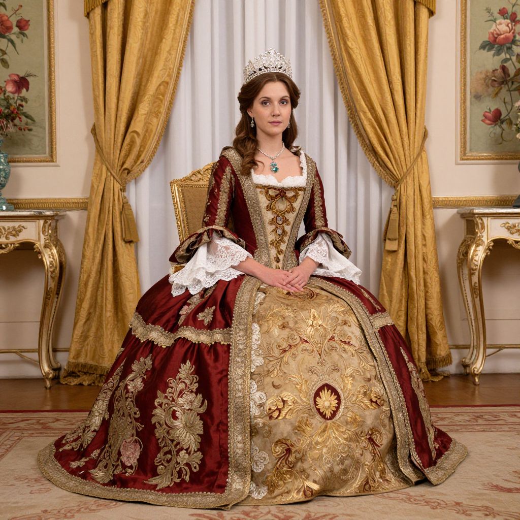 Photograph of a young woman with fair skin, dark brown wavy hair, and blue eyes, seated on an ornate gold chair. She wears an elaborate, Renaissance-style, deep burgundy and gold brocade gown with white lace cuffs, and a silver tiara. The gown is heavily embroidered with gold floral patterns. She has a necklace with a blue gemstone pendant. The background features golden curtains, floral paintings, and white drapes. The room has a classic, opulent decor with a patterned rug and wooden floor. The lighting is soft, highlighting the rich textures and colors of the gown and room.