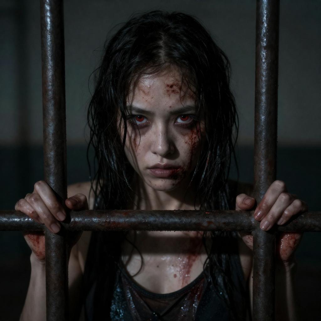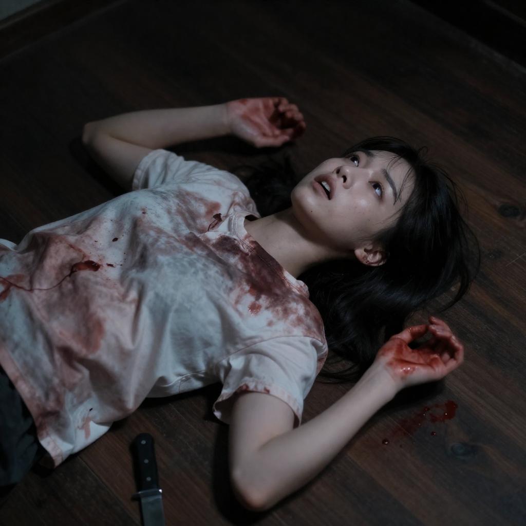 Photograph of a woman with pale skin and dark hair, lying on a leopard-print surface. She has a bloody slash on her left shoulder and is wearing a black, shiny top. Her eyes are closed, and her expression is one of pain. The background is blurred, focusing attention on her injured shoulder and distressed face.