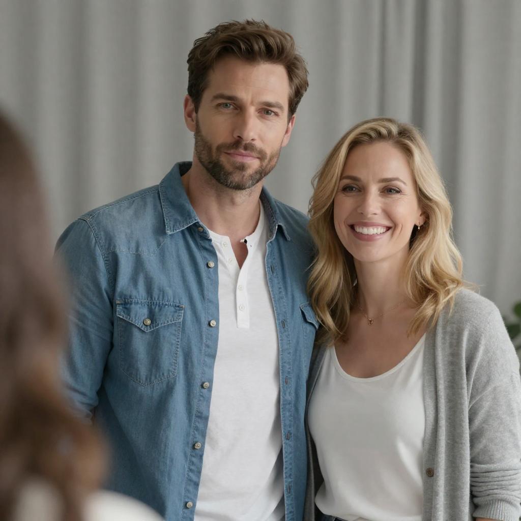 Photograph of a couple standing in a barn. Blonde woman with wavy hair, yellow t-shirt, blue jeans, smiling. Tall man with short brown hair, plaid shirt over white t-shirt, blue jeans, smiling. Hay bales in background. Both hands on hips. Warm lighting.