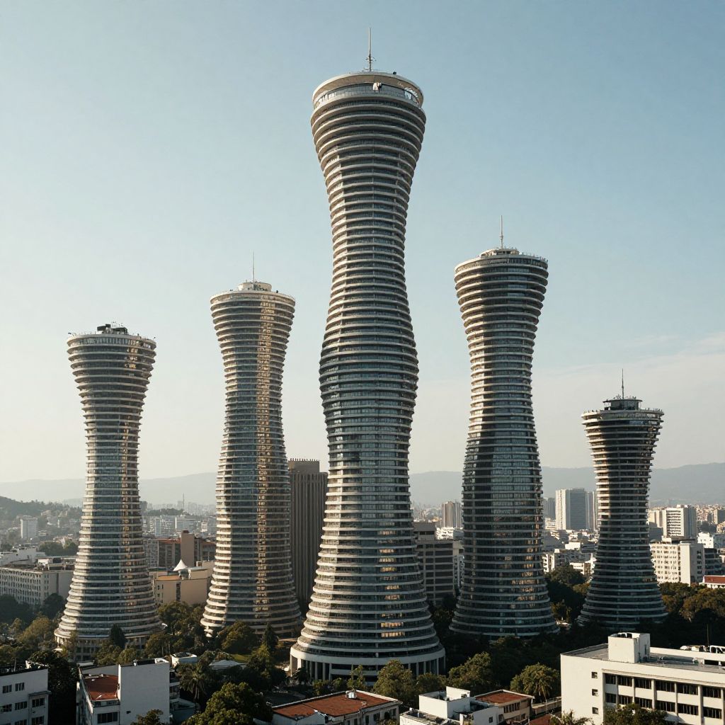In a city where towering spirals ascend like whispers of collective dreams, the architecture hums with the weight of shared thoughts, their rhythmic rotations echoing the ebb and flow of human emotion.