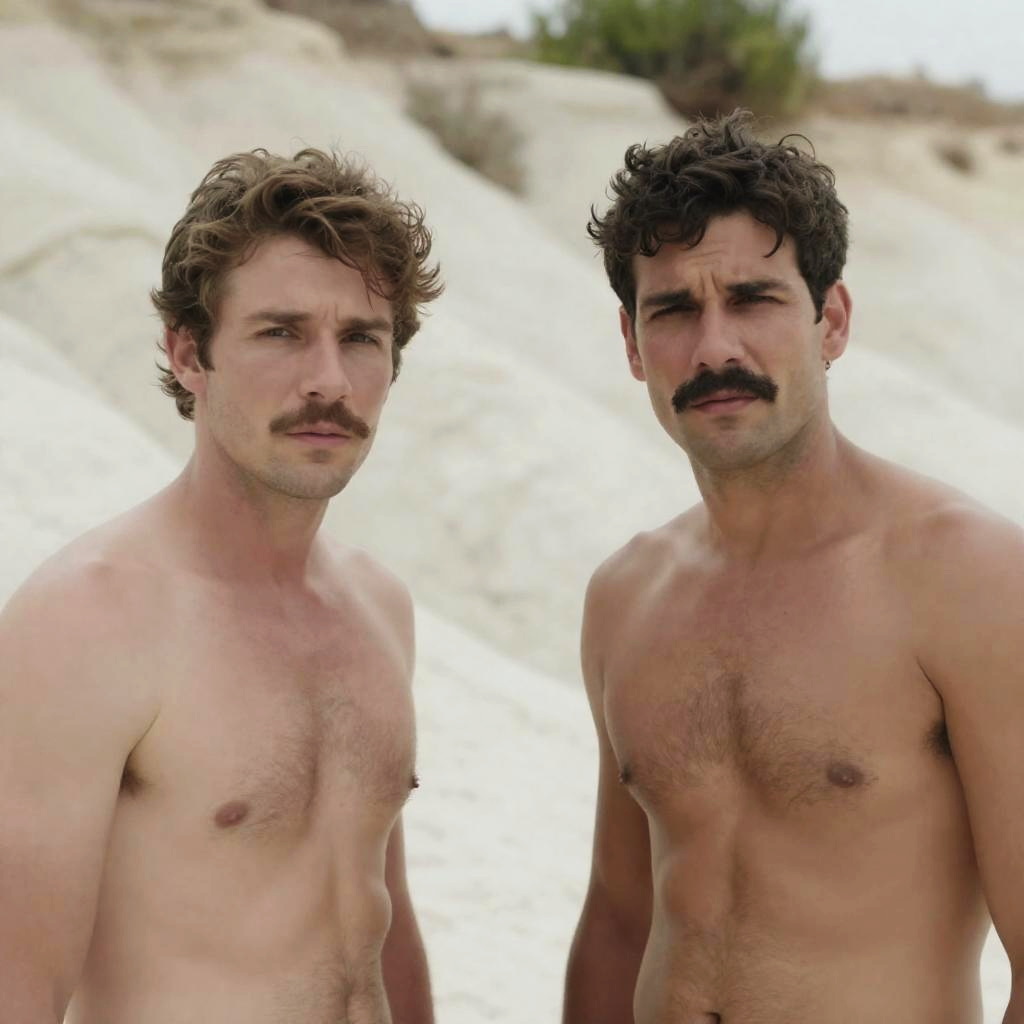 Photograph of two shirtless men with rugged features, standing in a white, rocky, desert-like landscape. Both have light skin, brown hair, and mustaches. The man on the left looks intensely at the camera, while the man on the right has a slightly puzzled expression. Sparse green vegetation is in the background. Bright daylight illuminates the scene.