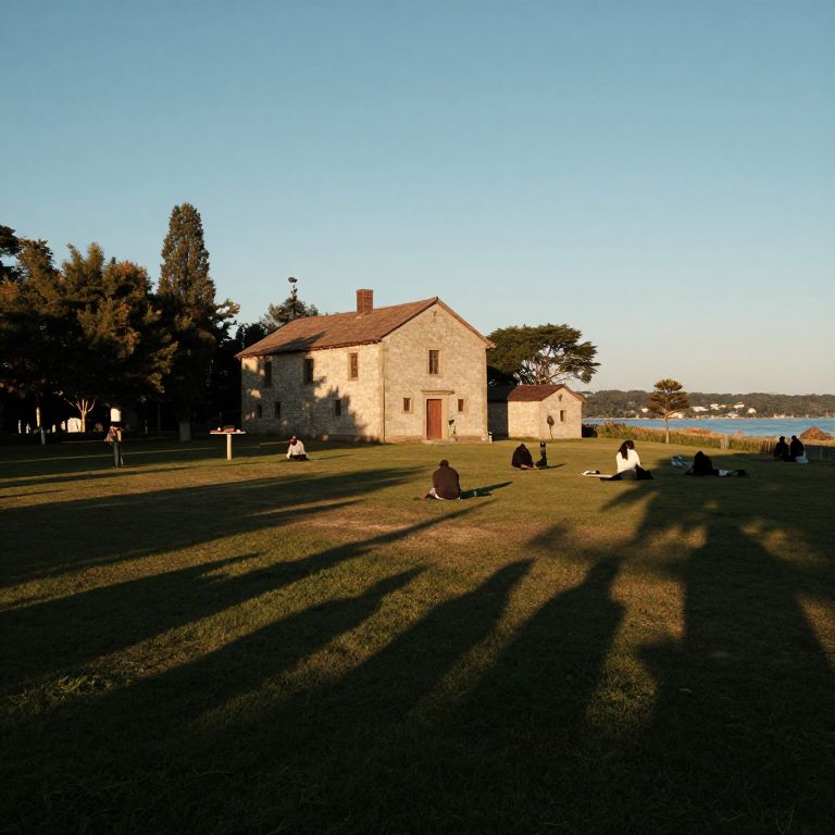On an island of perpetual vespers, shadows lead the daylight while figures remain frozen in eternal dusk-toned inactivity.