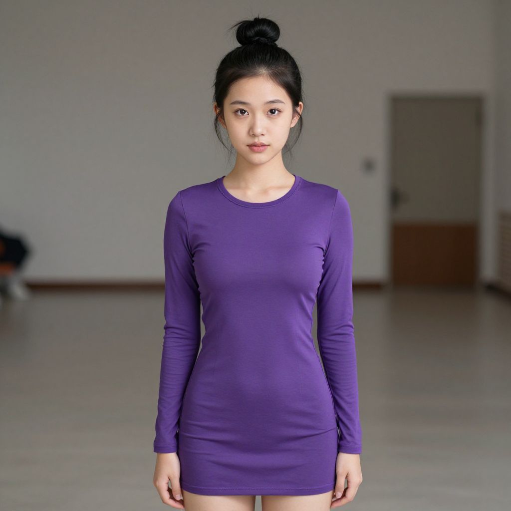 Photograph of an Asian woman with fair skin and black hair in a high bun, standing in a minimalistic, empty room with white walls and a gray floor. She wears a tight, long-sleeved, purple dress that fits her slim frame, highlighting her small breasts and slender build. Her expression is neutral, and she faces the camera directly. In the blurred background, there is a closed door and a hint of a black object on the left. The lighting is even, eliminating shadows. The image has a sharp focus on the woman, with a shallow depth of field.