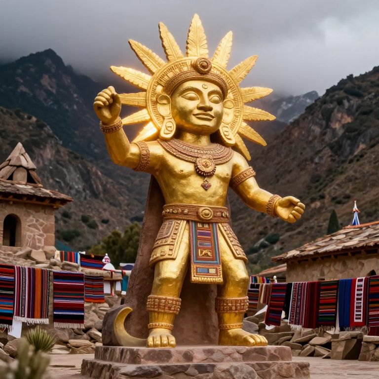 Inti, the radiant Incan sun god, depicted as a majestic golden figure emitting warm light over the Andes mountains, ancient temples and vibrant colorful textiles in the background, mystical atmosphere, rich cultural details, hyper-realistic style.