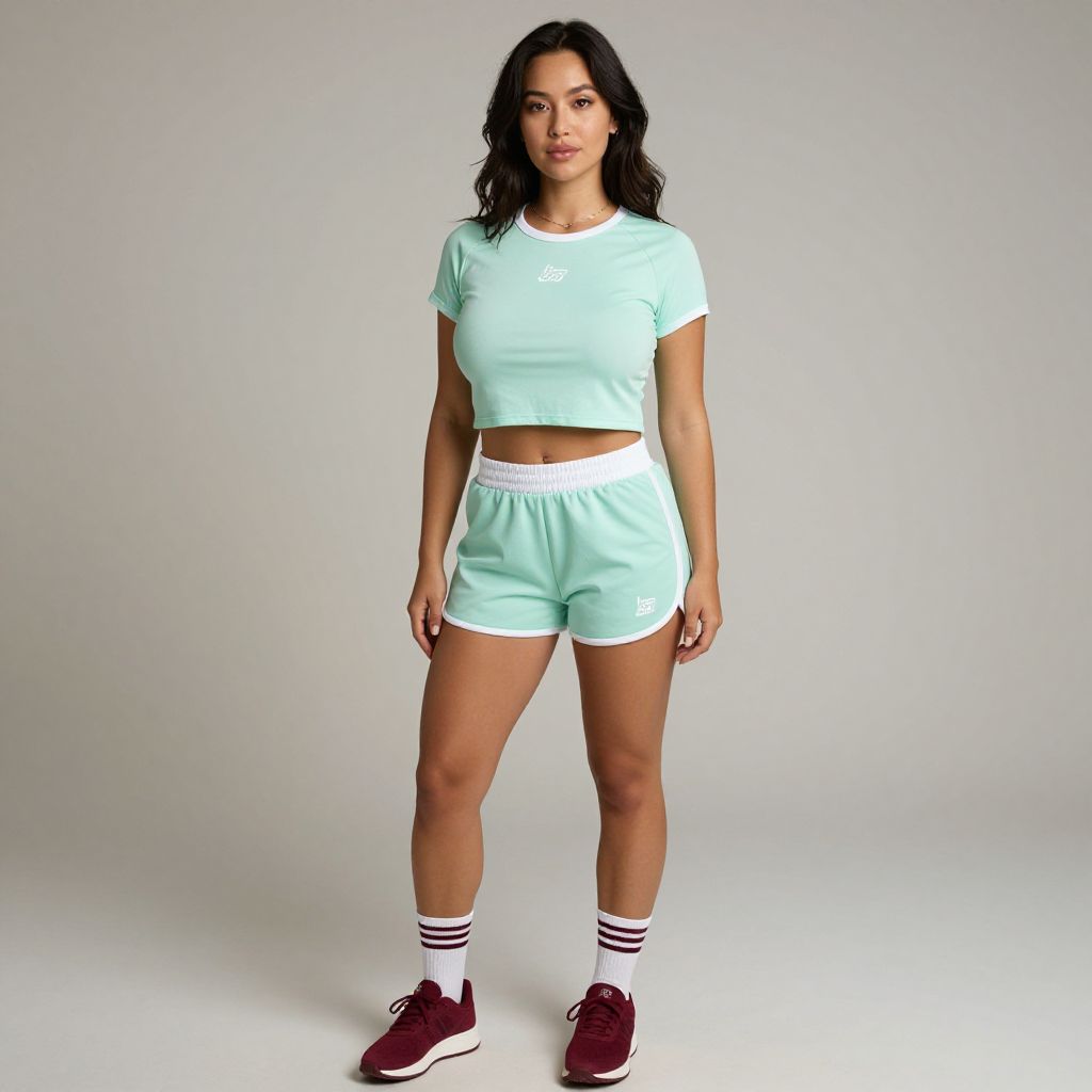 "Woman, sporty casual, mint green crop top with short sleeves and logo, matching athletic shorts with white trim and contrasting logo, crew socks with stripes, burgundy sneakers, minimal jewelry, studio background. Sexy. Pretty face and beаutiful eyes. Big breasts."