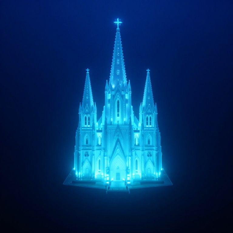 Photograph of a glowing, blue-lit, ice sculpture of a Gothic-style cathedral against a dark blue background. The sculpture features multiple pointed spires, intricate architectural details, and a cross at the tallest spire's peak. The illuminated ice structure emits a bright, cool blue light, highlighting its crystalline texture and delicate carvings. The base of the sculpture is slightly visible, suggesting a flat surface. The overall effect is ethereal and mesmerizing, creating a striking contrast between the dark background and the vibrant blue light of the ice structure.
