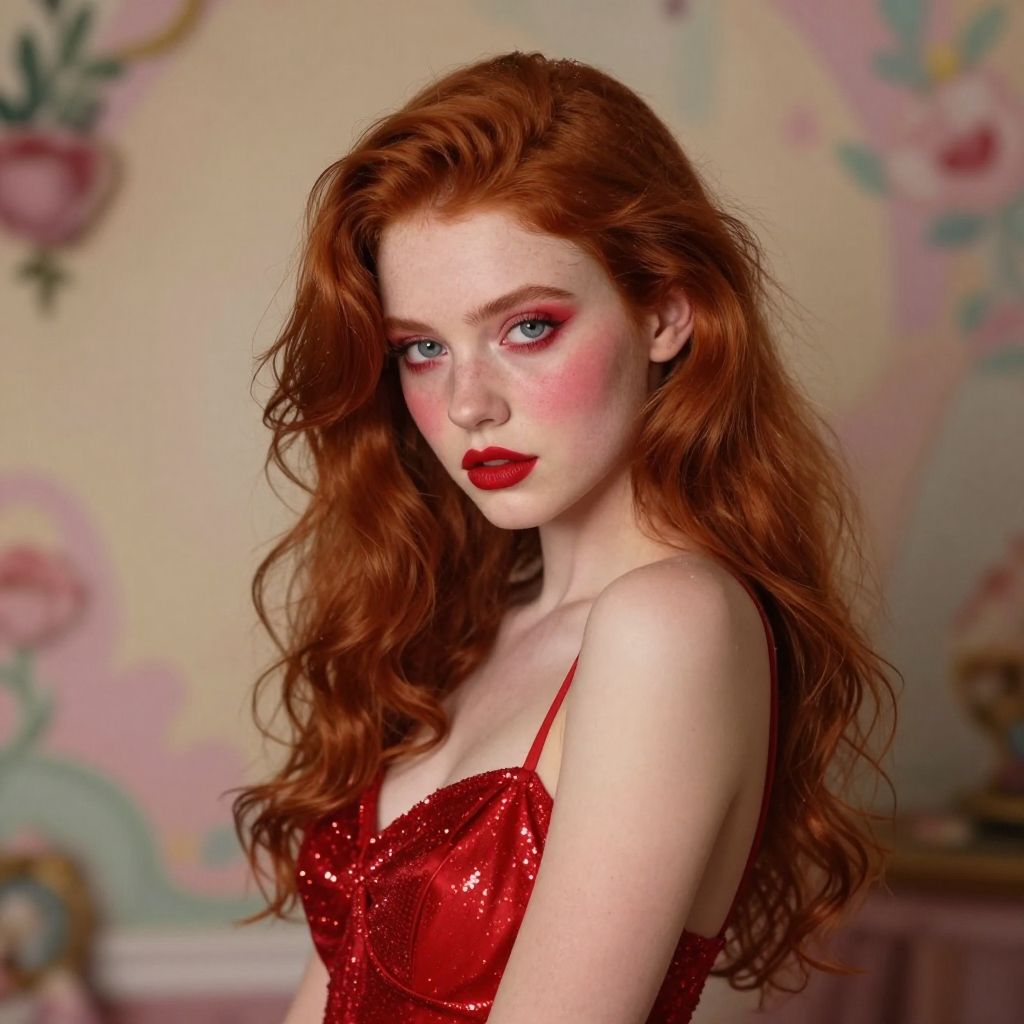 This is a digital artwork of a fair-skinned, red-haired woman with long, wavy hair and striking blue eyes. She has rosy cheeks and wears bold red lipstick. She is dressed in a sparkly, red, strapless top that highlights her slender figure. The background features a pastel-colored, floral-patterned wall with soft pink and blue flowers. The woman gazes directly at the viewer with a slightly pouty expression. The image has a realistic yet slightly stylized appearance, with detailed textures in her hair and clothing.