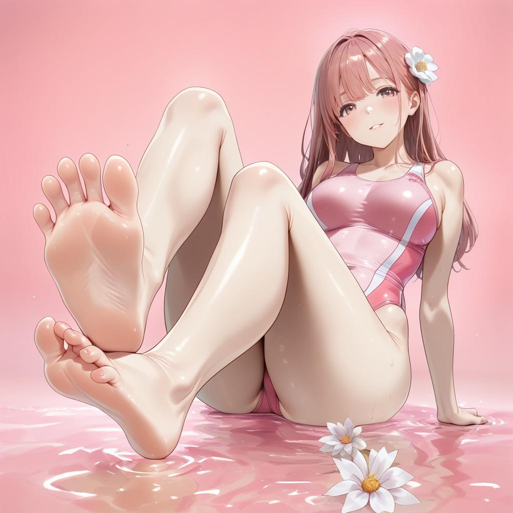 Big breasts, (from below:1.4), 1girl, solo, skinny, half closed eyes, medium breasts, long hair, (One-piece swimming suit), bangs, sitting, looking_at_viewer, open_mouth, red pink background, (smile), frown, (full body:1.6), flower, (foot focus:1.3), navel, (feet:1.2), (toes:1.2), thick thighs