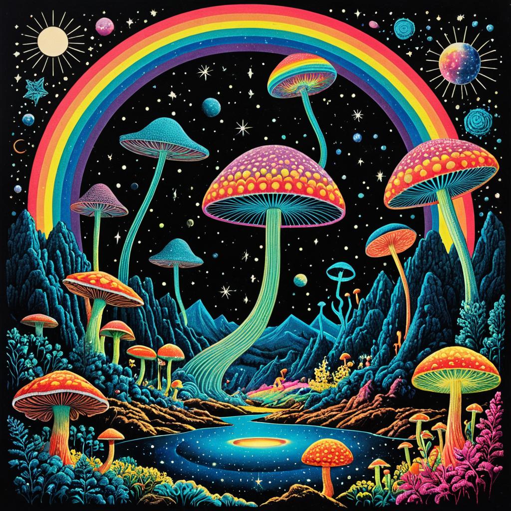 Vintage 70s psychedelic surreal sci-fi collage, neon-hued rainbows, cosmic nebulae, surreal alien landscapes, hovering crystals, abstract bioluminescent fungi, interlocking circular patterns, black night sky with stars