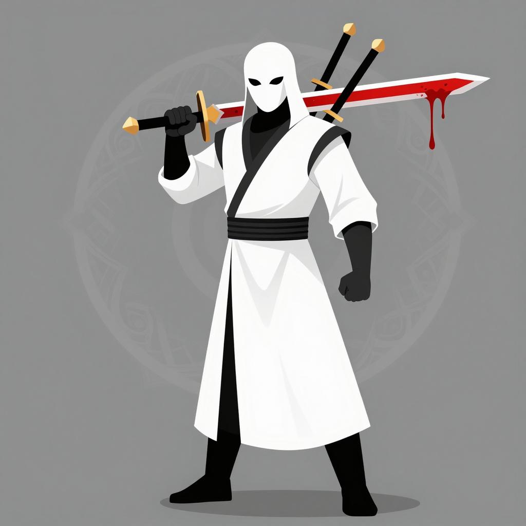 Illustration of a masked warrior in white robes with black trim, holding a blood-stained, glowing red sword over their right shoulder. Three swords are sheathed on their back. Grey background with blood drips and abstract white patterns. Warrior stands with a strong, upright posture.