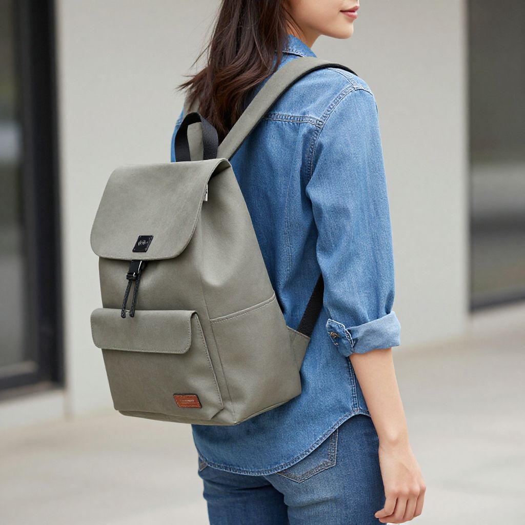 Female model wearing a denim shirt and jeans with a backpack on her back.