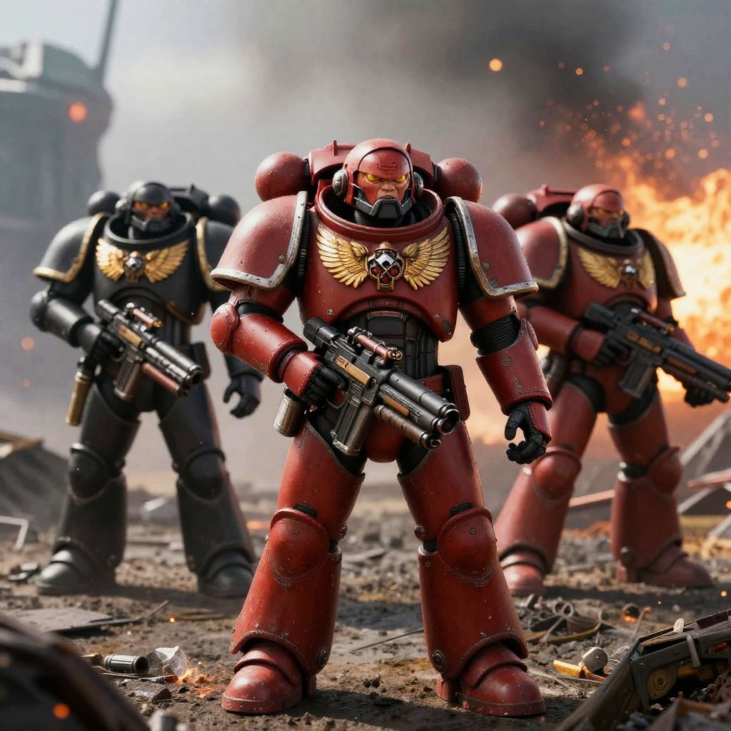 Red and black space marines standing on a distant alien battlefield, heavy armor adorned with futuristic weapons, dramatic lighting highlighting their intense expressions, sci-fi war environment with explosion in background, highly detailed, dynamic composition.