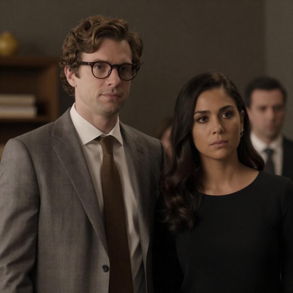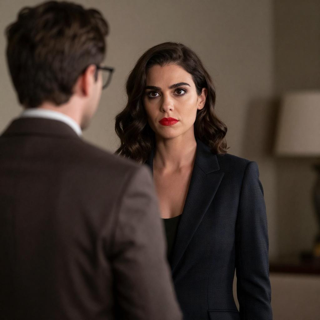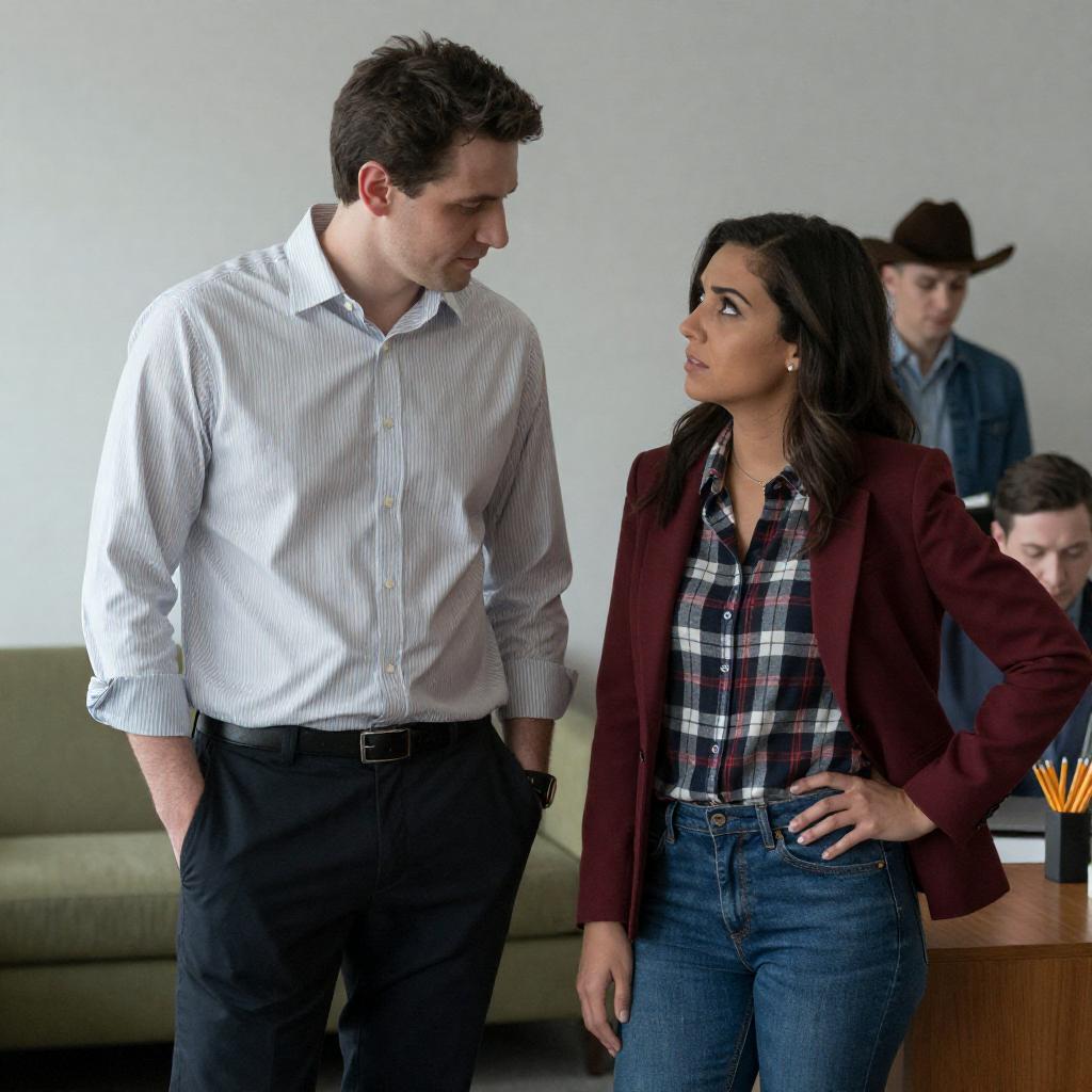 Photograph of two people in an office. Man with dark hair, striped shirt, black pants, hands in pockets, looking down. Woman with dark hair, red blazer, plaid shirt, blue jeans, hand on hip, looking up at man. Background: office setting, green couch, two other people, one in cowboy hat. Objects: desk with pencils, bottle. Woman's intense gaze, man's downcast look.